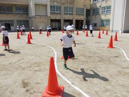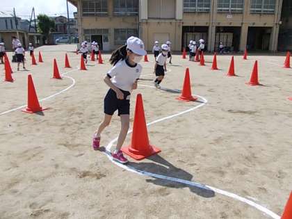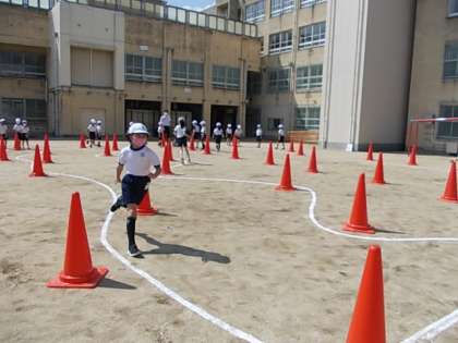 自分たちで作ったオリジナルコースを走ります。気持ちよく走れるコースはどんなコースかな。微調整を加えながら,何度も全力疾走を楽しんでいました。