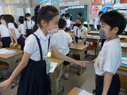 あいさつと自己紹介をします。先生が教えてくれたリズムにのって行います。みんな,楽しそう♪