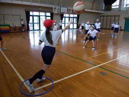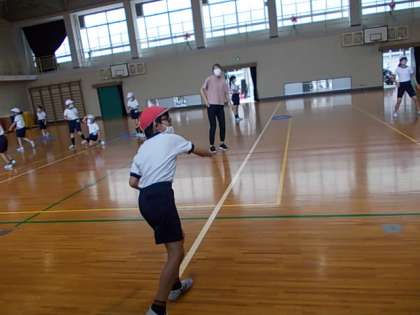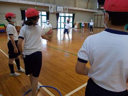 体育館の中で,ベースボール型ゲームに取り組んでいます。相手の間をねらい,高得点をめざします。力いっぱいボールを打つと気持ちがいいね♪