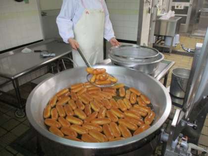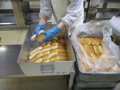 ひとつは,数を数えてパン箱に入れていきます。もうひとつは,揚げパンにするため,数を数えて調理室にもっていきます。油で揚げて,グラニュー糖をまぶして,数を数えて袋に入れて,出来上がりです。