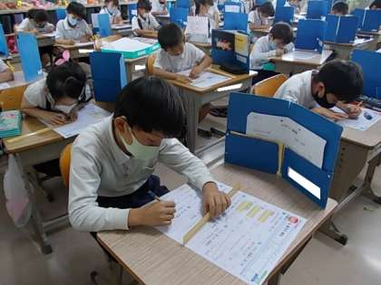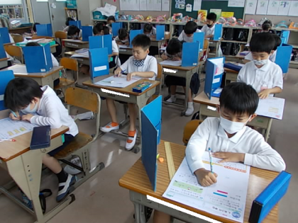 「長さ」のテストに取り組んでいました。竹尺を使って問題に挑みます。