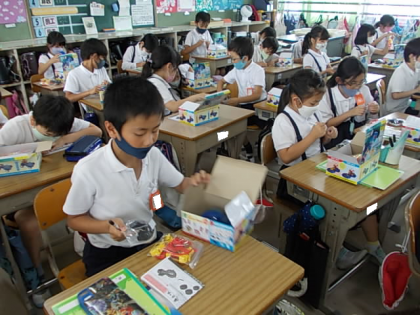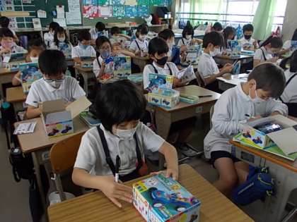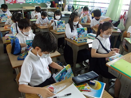 電気の学習が始まります。それに先立ち,一人一人に実験キットが配られました。なくさないようしっかり名前を書いています♪