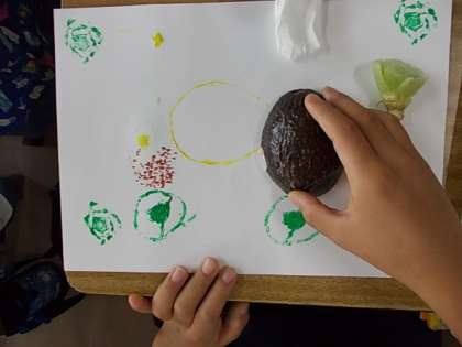 野菜を使ってスタンプ遊びしました。ピーマン,オクラ,ねぎのはし,じゃがいも,にんじん,…おうちから持ってきたいろんな野菜が大活躍。かわいらしい作品ばかりでした♪