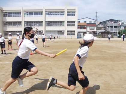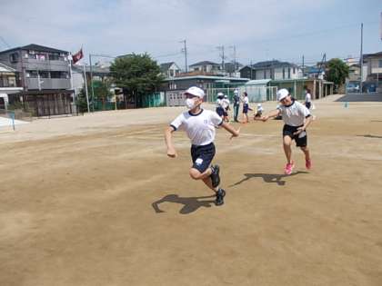 グループでリレーの学習に取り組んでいます。これまでの自分たちのタイムを更新するためには,バトンタッチの上達が必須!全速力でバトンの受け渡しができるよう練習しています。