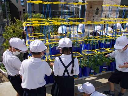 どんどん成長しているあさがお。もっと大きく育てるためにはつるが伸びるための支柱を付けました。早く花が咲いてほしいね♪
