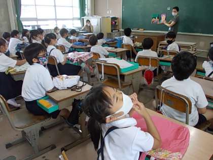 図書の時間の初めに,図書の先生が読み聞かせをしてくださいます。今日もとってもおもしろいお話を聞かせてくださいました。みんな,笑いを止めるのに必死の様子でした。