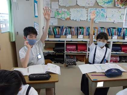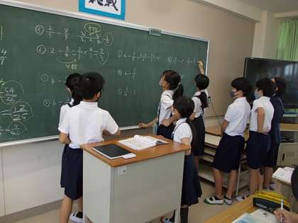 分数のわり算の練習問題に取り組みました。分母と分子をいれかえてかける!これを基本にして,さまざまな問題にチャレンジしています。