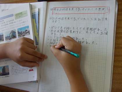 「私たちのまち堺」の中にある「堺市の地図」を見て,気づいたことをどんどん書き出しています。区ごとの特徴もありそうですね。