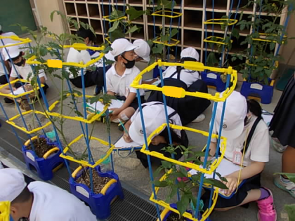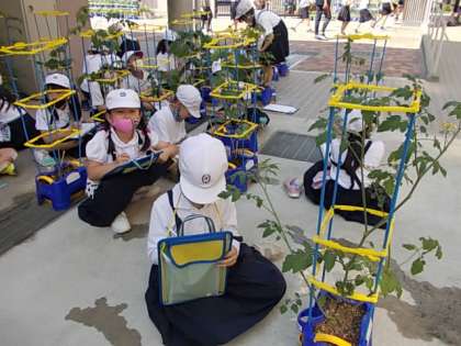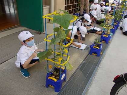 大きく成長している夏野菜の観察をしました。もう収穫も始めます!新鮮な夏野菜をお家に持って帰ります。