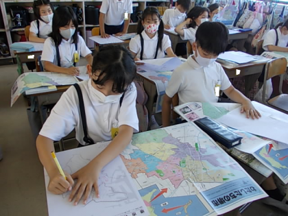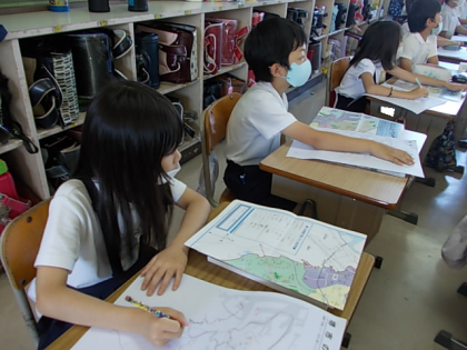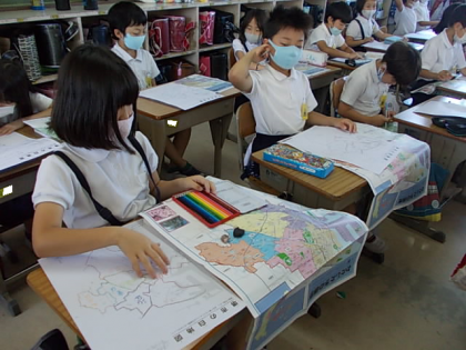 白地図に,調べたこと,わかったことをどんどん書き加えていきます。今日は各区ごとの特徴を考え,それが伝わるように書きたしていきました。