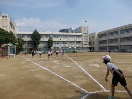 新体力テストのソフトボール投げの測定に取り組んでいます。遠くまでボールを投げるためには,かなり上をめざして投げなければなりません。さらに,30度という狭い角度の中にボールをコントロールしなければなりません。ちょうど,市役所の特上にある赤いアンテナがちょうどいい目印になりそうです。