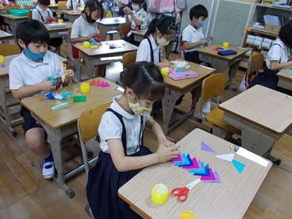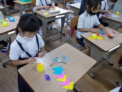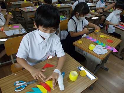 もうすぐ七夕ですね。みんなで笹飾りの作成,がんばっていました。