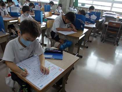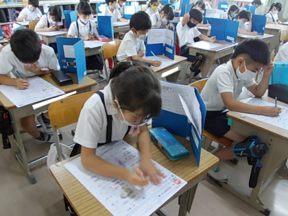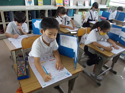 1000までの数のテストに取り組んでいます。みんなの真剣な表情,かっこいい!