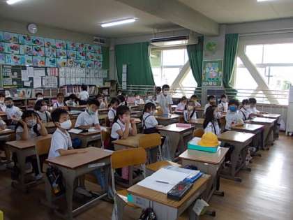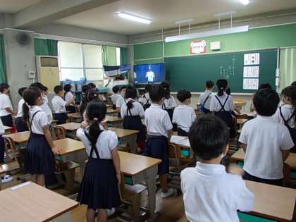 全校朝礼が始まりました。あいさつの後,心を込めて校歌を清聴しました♪