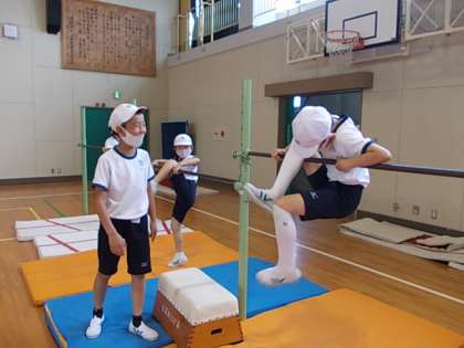 これまでがんばってきたひざかけ上がりを生かし,片ひざかけ回りにチャレンジしました。ぐるっと一周回れると気持ちがいいよね♪みんながんばれ!