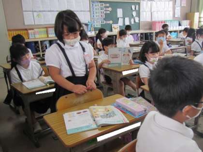 ひき算の筆算の練習問題に取り組んでいます。文章問題を読み,みんなでその内容について共通理解をはかっています。