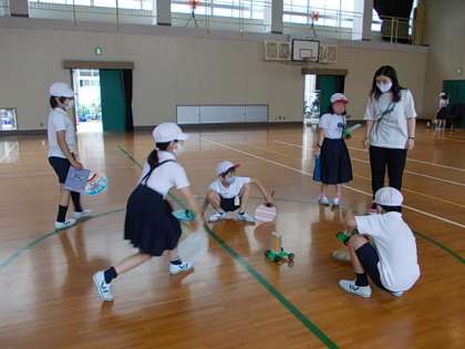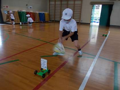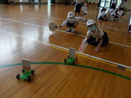 風の力で動くマイカー,うちわを使ってできるだけ速く動かす方法を探っています。みんな,真剣そのものでマイカーに風を送っています。