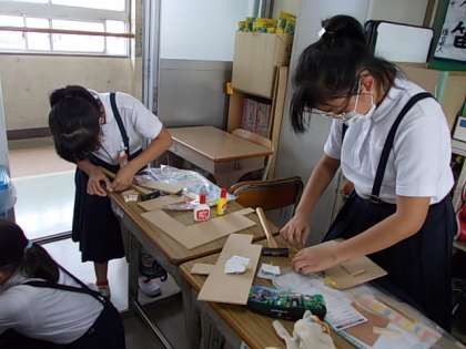 どんどん作業が進んでいます。組立作業に入る児童も出てきました。だんだん全体像がはっきりしてきました。