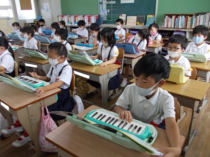 けんばんハーモニカを使った学習です。が,まだ息を吹き込んで演奏することはできません。口で音階をうたいながら練習しています。