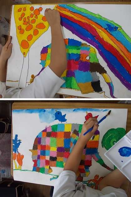 カラフルなエルマーを作成中です。色とりどりのぞう,かわいく書けていますね♪