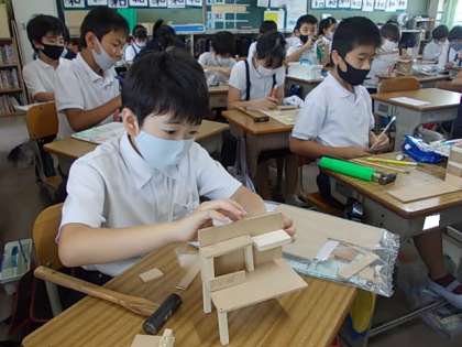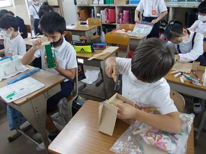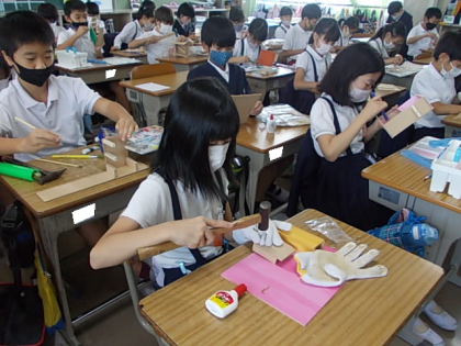かなづちやのこぎりを使って作成してきた木工作品もそろそろ完成が近づいてきています。色を縫ったり,細かい部分の形を調整したりして最後の仕上げに取り組んでいます。