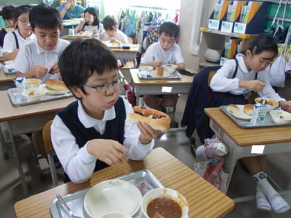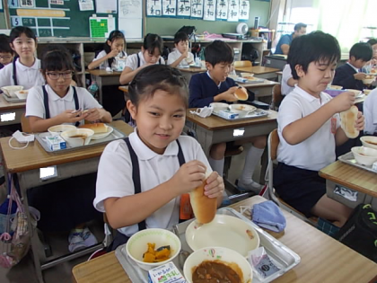 ブルーベリージャムをつけてパンを食べます。ジャムがついてくるといつも以上に給食の時間が楽しくなりますね。