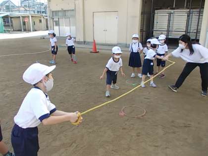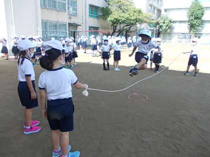 長なわに挑戦中です。なわを跳び越える感覚を身につけようね♪