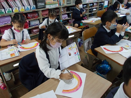絵の具の混ぜ方について学習していました。水の多さも大切だね。きれいな虹ができてきています♪