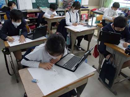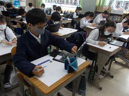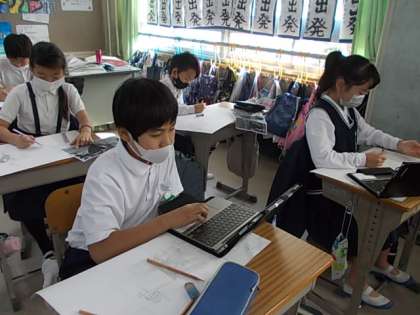 ソーラン節を踊る自分を描きます。それに先立ち,しっかり背景を描いています。タブレットに映る校舎の写真を見ながら丁寧に描き進めています♪