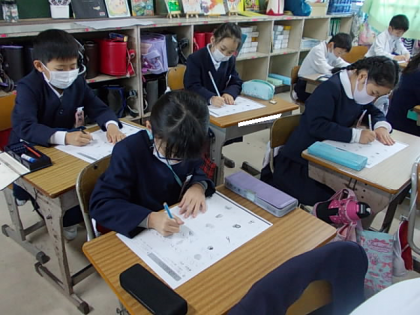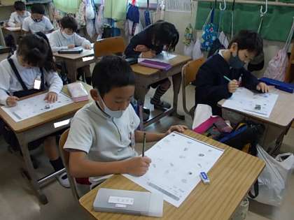 朝の学習タイムです。2年生の今日のプリントは,カタカナの言葉つくりでした。