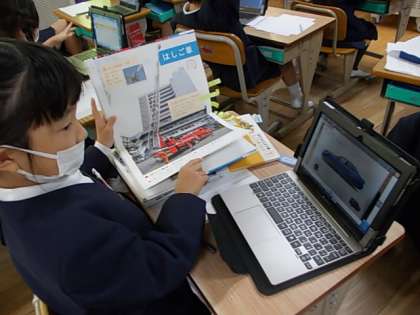すごい!タブレットを使って,自分が選んだはたらく自動車について調べていました。いい百科ができあがったらいいね♪