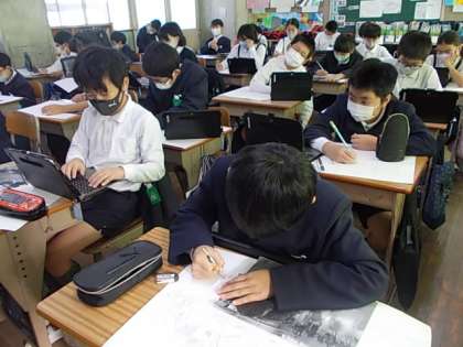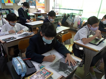 ソーラン節を迫力満点で描く自分を描きます。印刷した写真やタブレットに映る写真を見ながら,丁寧に描き進めています♪