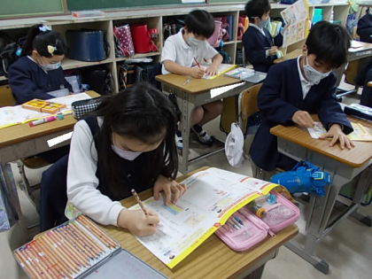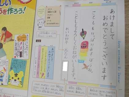 年賀状の書き方について学習しました。新年にふさわしいあいさつの言葉を選んだり,自分の近況を短くまとめたりしながら書きます。