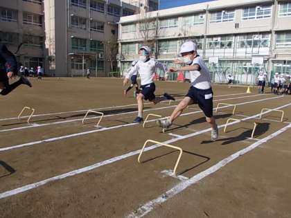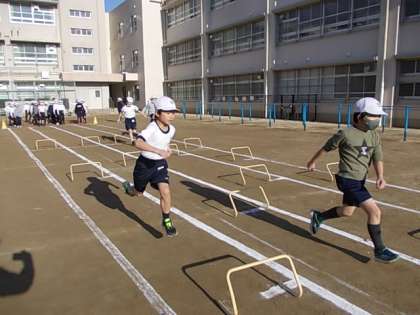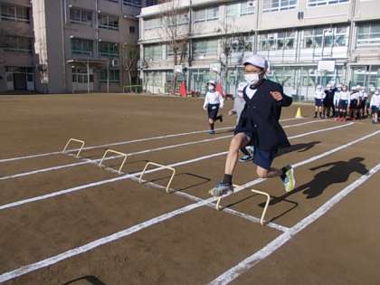 ミニハードルを使ったかけっこに取り組んでいます。寒い中ですがみんな元気に,さっそうとミニハードルを走り越えていました♪