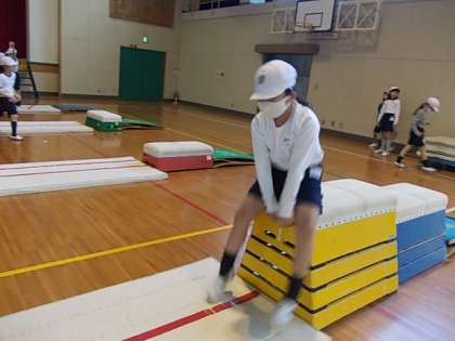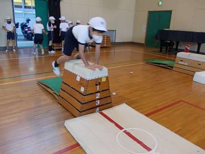 跳び箱を使った運動遊びに取り組んでいます。ゲーム形式でいろんな動きにチャレンジしていました。