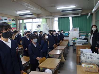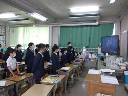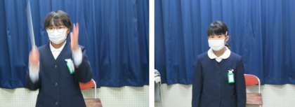全校朝礼が始まりました。朝のあいさつの後,心を込めて校歌斉唱♪