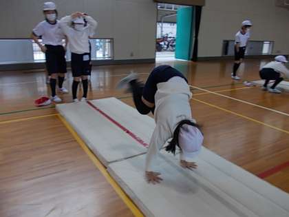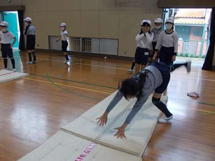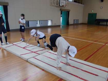 4年生のマット運動は側方倒立回転を中心に学習します。今日はその準備運動としても取り組む「川飛び」に取り組みました。両肩にしっかり体重を乗せてマットを飛び越します。