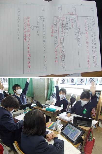 説明文「固有種が教えてくれること」の学習です。タブレットの電子教科書にチェックを入れたり,考えを書き込んだりしながら進めています。便利ですね。