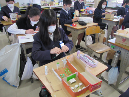 世の中のさまざまな課題を解決できる夢の街,環境づくりに取り組みます。模型の世界で表現します。みんな,とても楽しそうに取り組んでいます。