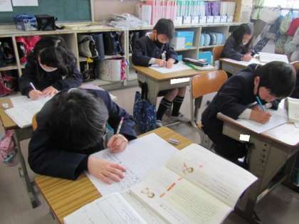 2年生の出来事を思いだし,特に印象に残っていることを作文します。作文メモを見ながら本文を書き進めています。