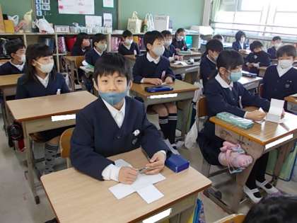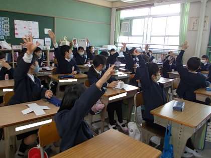 次はみんなが楽しみにしている体育の授業です。今日から「パイナップルジャンプ」の学習が始まります。ケンケン,大また走り,ケンパ,…いろんな跳び方で「パ・イ・ナ・ツ・プ・ル」と進みます。跳び方を決めるのはサイコロです。