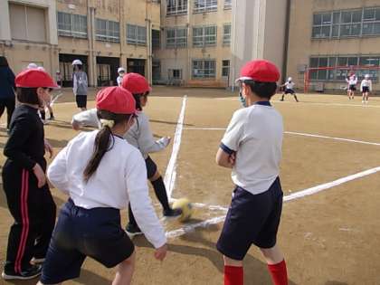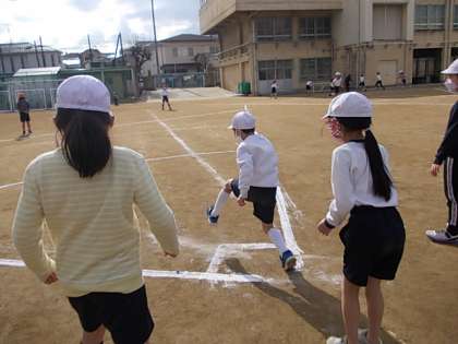 キックベースの学習が始まりました。今日は,ルールをおぼえ,ゲームのおもしろさを探ります。たくさんのおもしろさを見つけられたかな。