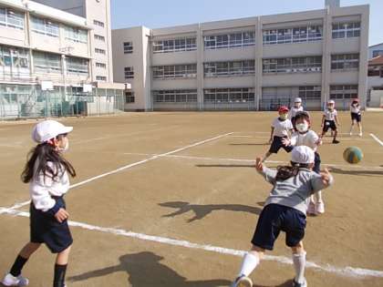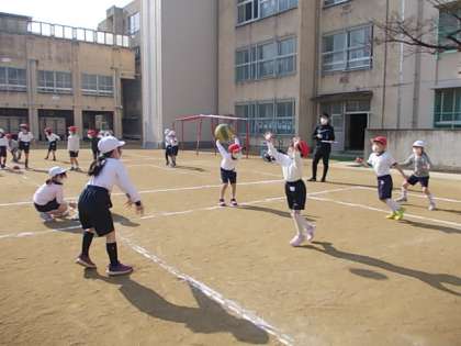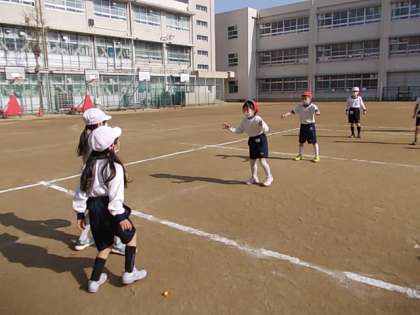 バウンドパスゲームに取り組んでいました。今日はルールを覚えて,ゲームを楽しむことがめあてです。どんなところがおもしろかったかな。