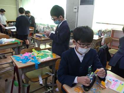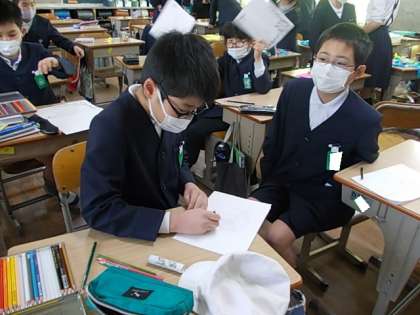 今年度の卒業式にも在校生は参加できなくなりました。5年生は自分たちが今できる形で6年生の卒業を祝福できるようなも企画を考えてくれています。1年生から4年生と協力して進めています。