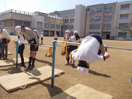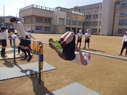 前方支持回転の成功をめざして,練習に取り組んでいます。支持の姿勢から勢いをつけるにはどうしたらいいかな。みんなで工夫しながら取り組んでいました。