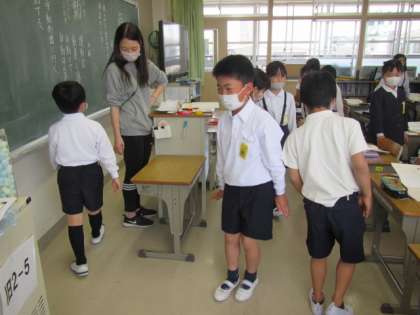 詩「どきん」をみんなで味わっていました。「あるきはじめるかぁ ひたひた」という言葉を取り上げ,みんなで実際にどんな歩き方なのかを考えていました。