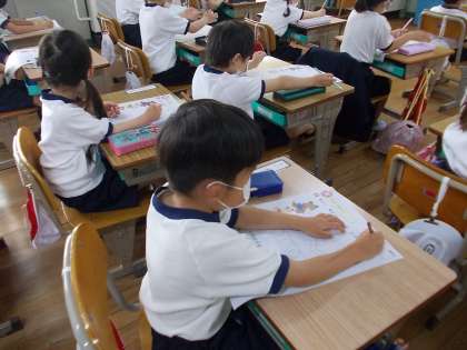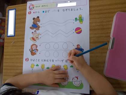 えんぴつをしっかり持って,いろんな線を引いてみよう。まっすぐな線,かくかくの線,ぐるぐるの線,…みんな,集中して取り組んでいました。