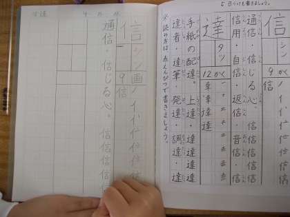 4年生で学ぶ漢字の学習が始まりました。今日は「信」と「達」お手本を見ながら丁寧に練習しています♪