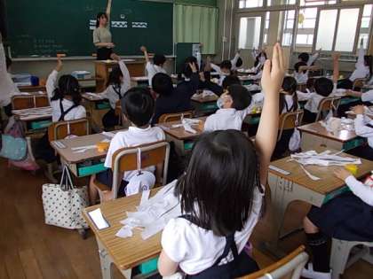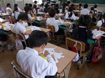 でんぷんのりを使ってみました。指をつかってのりを広げます。指にいっぱいつけるのがいいのか,ちょっとつけるのがいいのか,実際にやって確かめました♪