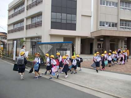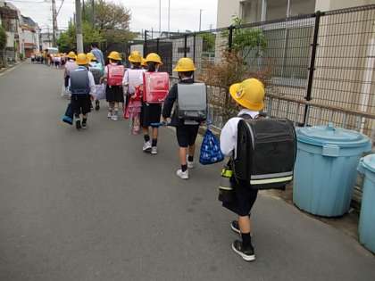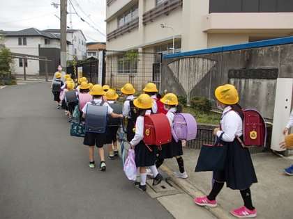 道路の端を列になって下校します。6年間ずっと安全第一で登下校しようね♪